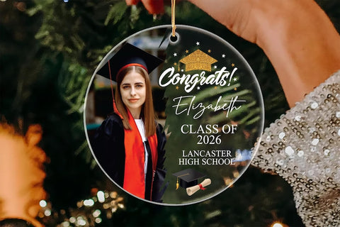 Celebrate your 2026 graduate with our personalized acrylic ornament! This unique keepsake is perfect for showcasing their graduation photo. Customized with their school and name, it's a thoughtful gift to commemorate their achievement. The ideal graduation gift that will be cherished for years to come.