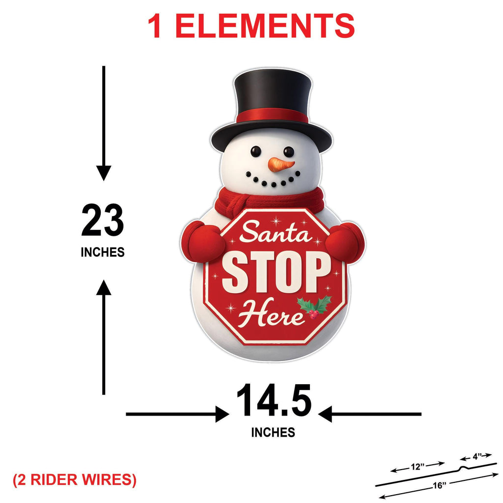 Welcome Santa with charm using our Snowman Santa Stop Here Yard Sign! Featuring a smiling snowman in a top hat and scarf holding a festive red “Santa Stop Here” sign, this decoration is perfect for creating holiday magic in your yard, garden, or patio. Made from durable 4mm corrugated plastic, UV-printed for fade resistance, and waterproof for long-lasting outdoor use. Rust-free metal stakes are included for quick setup in soft ground.