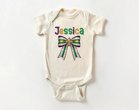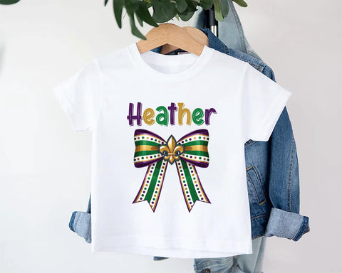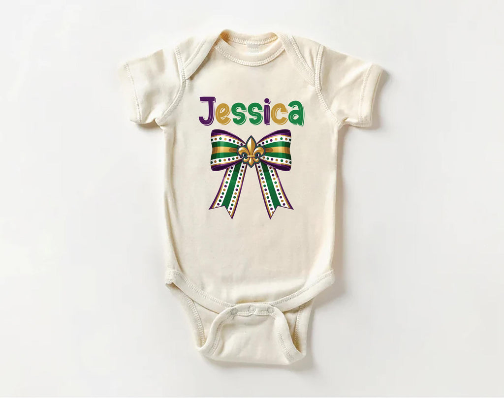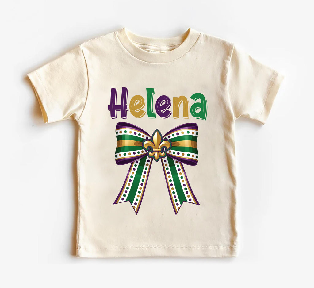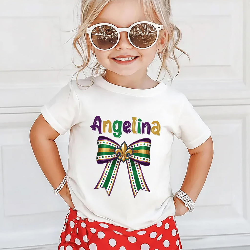 Coquette Mardi Gras Toddler Shirt, Custom Name Carnival Bow Shirt, Cute Mardi Gras Tee, Toddler Carnival Outfit Shirt, Mardi Gras Shirt