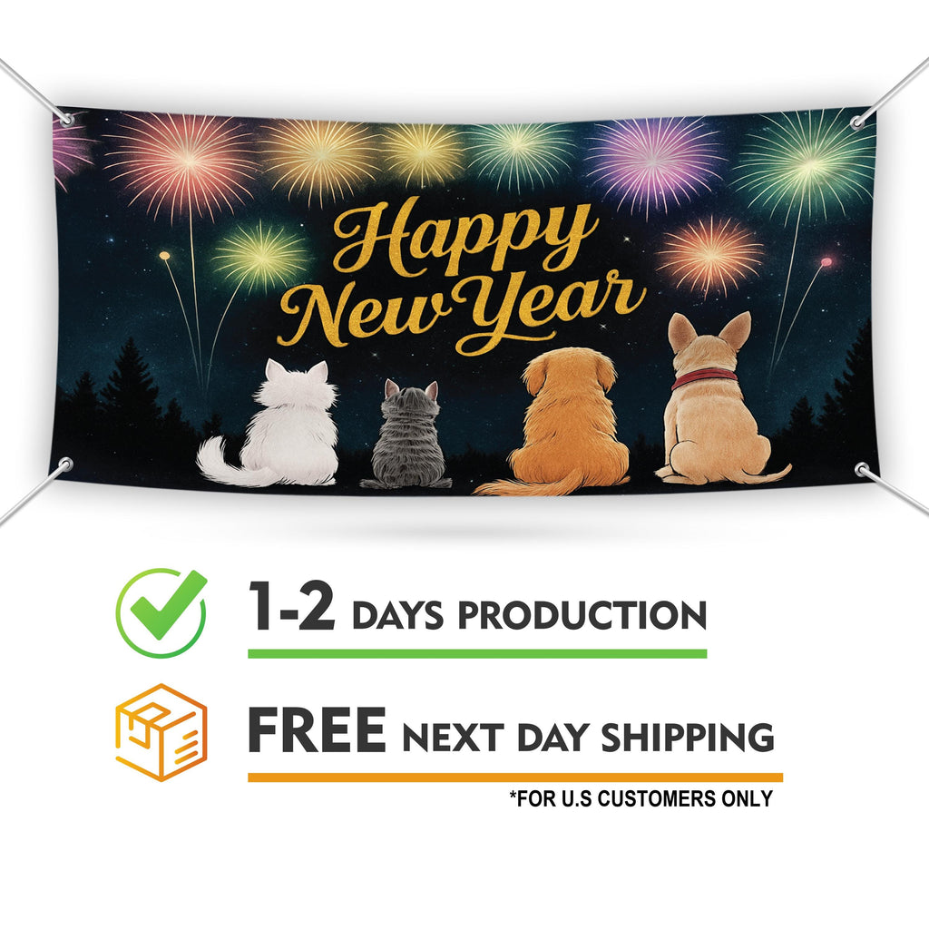 Happy New Year 2026 Banner Sign - Fireworks Cat Dog New Year’s Eve Party, Holiday Welcome New Year Vinyl Banner with Metal Grommets