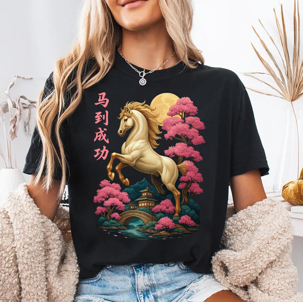 Celebrate the Year of the Horse with our Happy Chinese New Year 2026 Shirt! Designed with a modern crescent and horse motif, this festive tee brings luck, joy, and style to your Lunar New Year celebrations.