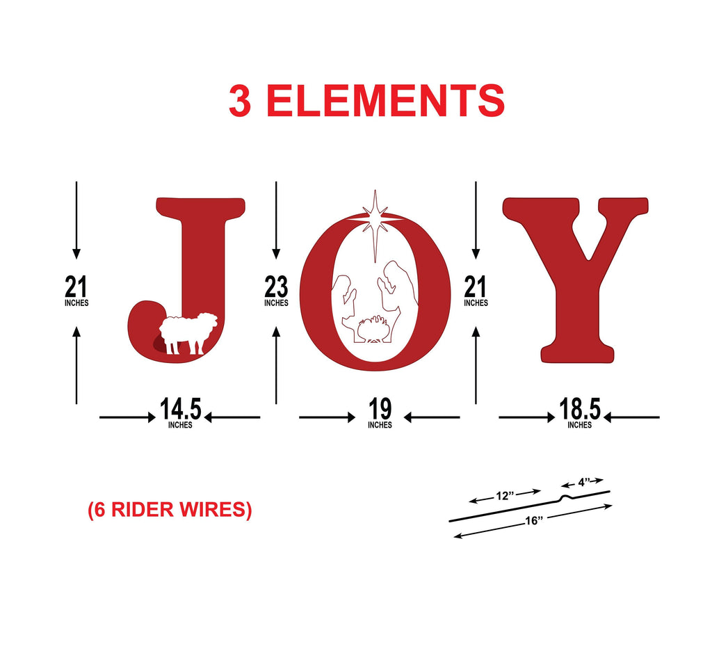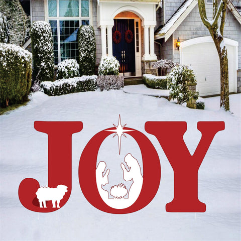Celebrate the true meaning of Christmas with this Nativity JOY Yard Sign. Featuring the Holy Family scene inside the letter “O,” along with a sweet lamb detail, this inspirational outdoor decoration brings a warm and reverent touch to your holiday display. Perfect for your front yard, walkway, porch, church grounds, or garden.