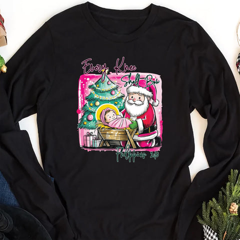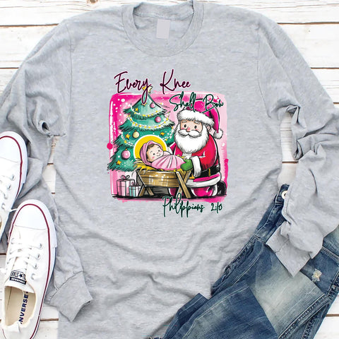 Honor the reason for the season with our Nativity Scene Shirt! Featuring a stunning watercolor Baby Jesus design and the phrase “Every Knee Shall Bow,” this shirt is perfect for celebrating your faith this Christmas.