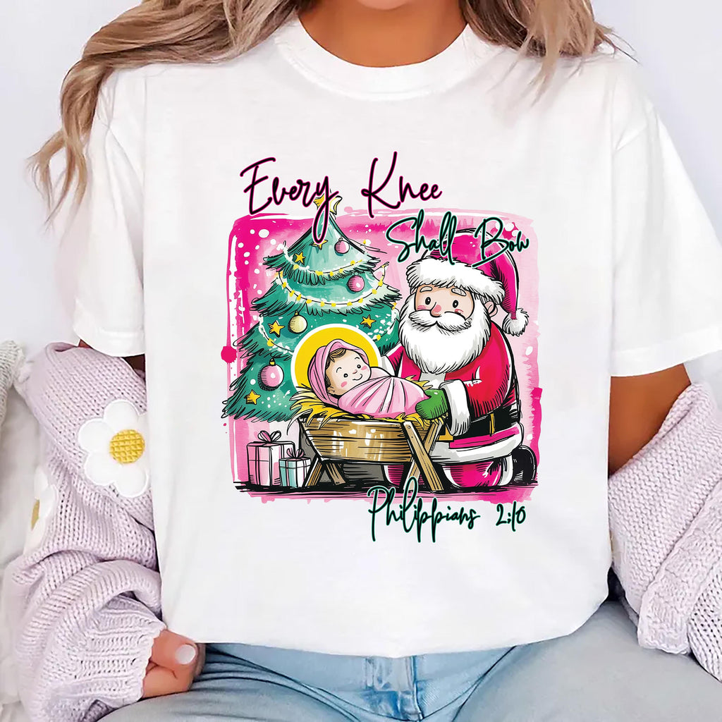 Honor the reason for the season with our Nativity Scene Shirt! Featuring a stunning watercolor Baby Jesus design and the phrase βEvery Knee Shall Bow,β this shirt is perfect for celebrating your faith this Christmas.