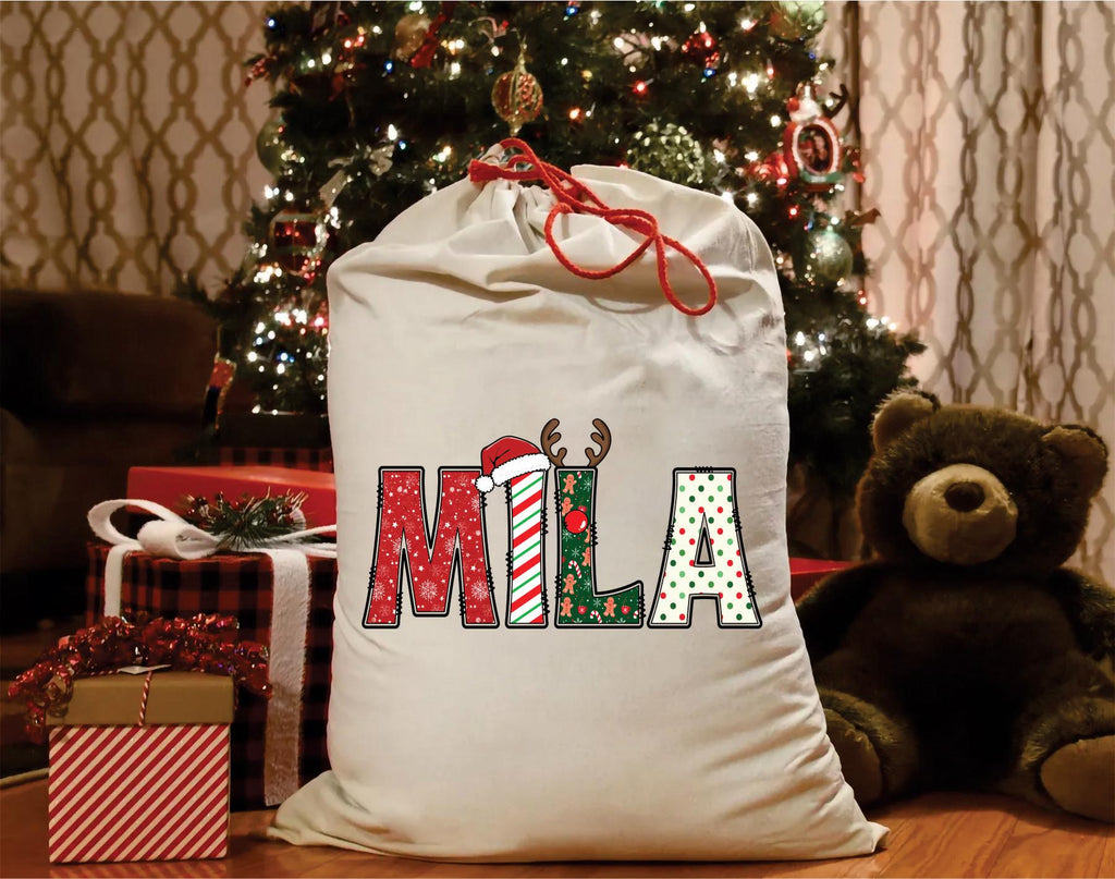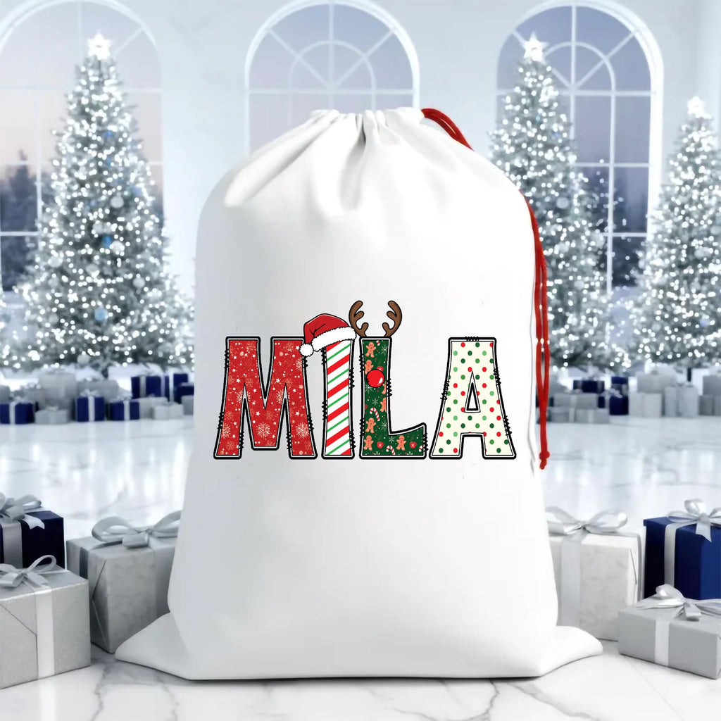 Make Christmas morning even more magical with this adorable custom Santa Sack featuring your child's name in festive alphabet letters. Each letter is decorated with charming Christmas elements—candy cane stripes, snowflakes, polka dots, reindeer antlers, and Santa hats—for a joyful holiday look!