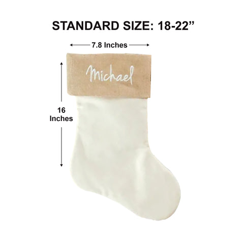 Elevate your holiday mantel with these beautifully handcrafted personalized Christmas stockings, available in six natural-style designs. Each stocking is made from a combination of natural burlap, ivory quilted fabric, and premium cotton canvas for a warm, timeless Christmas look. Fully lined, perfectly padded, and designed to hang beautifully — even when empty — these stockings bring an elegant, cozy touch to your home decor.