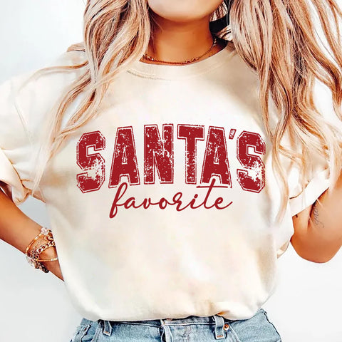 Show off your holiday spirit with our Santa's Favorite Christmas Shirt! This fun and festive tee is perfect for women who love Christmas humor and cozy holiday style.