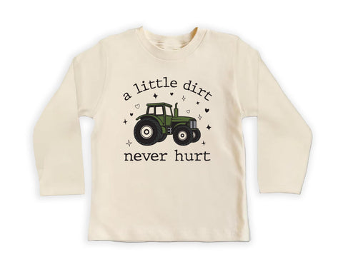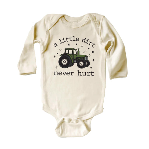 Let your little country boy embrace the mess with this A Little Dirt Never Hurt onesie, baby bodysuit, baby shirt, and toddler sweatshirt! Featuring a trendy farm and tractor design, it’s perfect for outdoor-loving families, country-themed birthdays, farm visits, or gifting your little dirt-loving cutie.