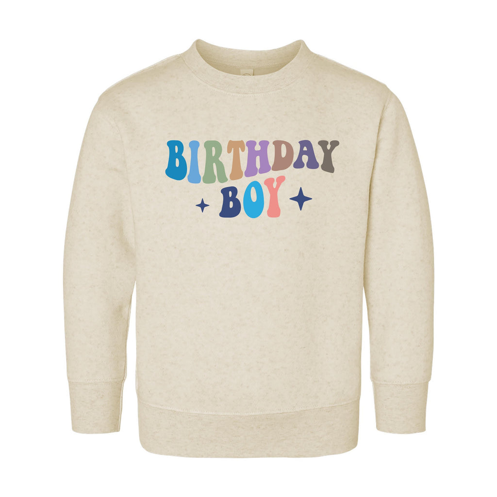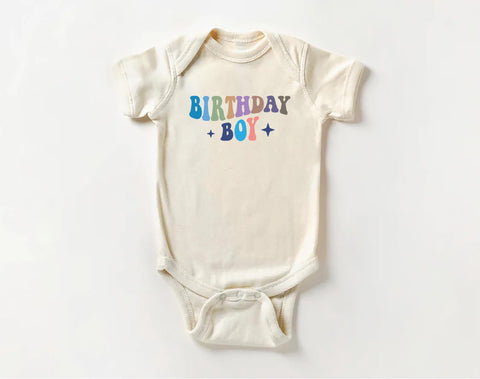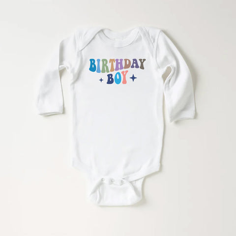 Celebrate your little one's big day with this Birthday Boy onesie, baby bodysuit, baby shirt, and toddler sweatshirt! Featuring a cute retro rainbow design, it’s perfect for birthday parties, cake smash sessions, family photos, or making your little boy feel extra special on his day.