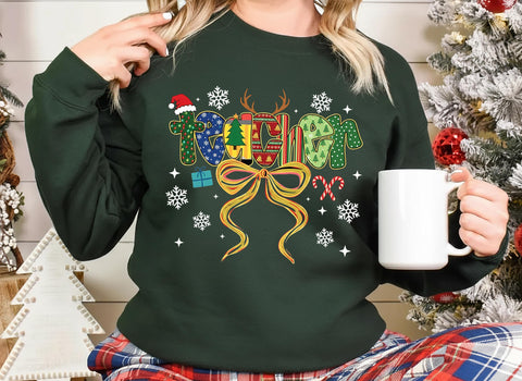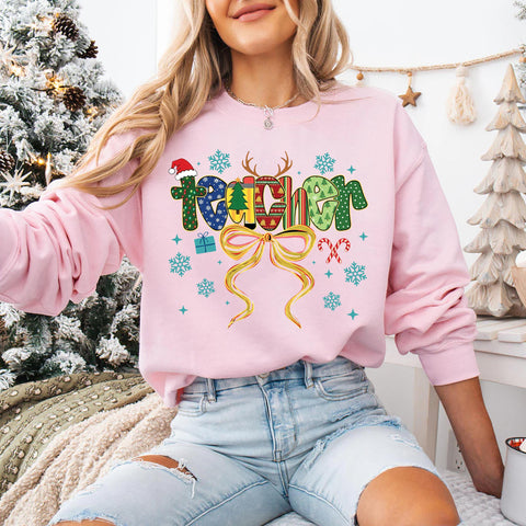 Coquette Christmas Teacher Sweatshirt, Merry Christmas Teacher Shirt, Christmas Teacher Coquette Bow Sweatshirt