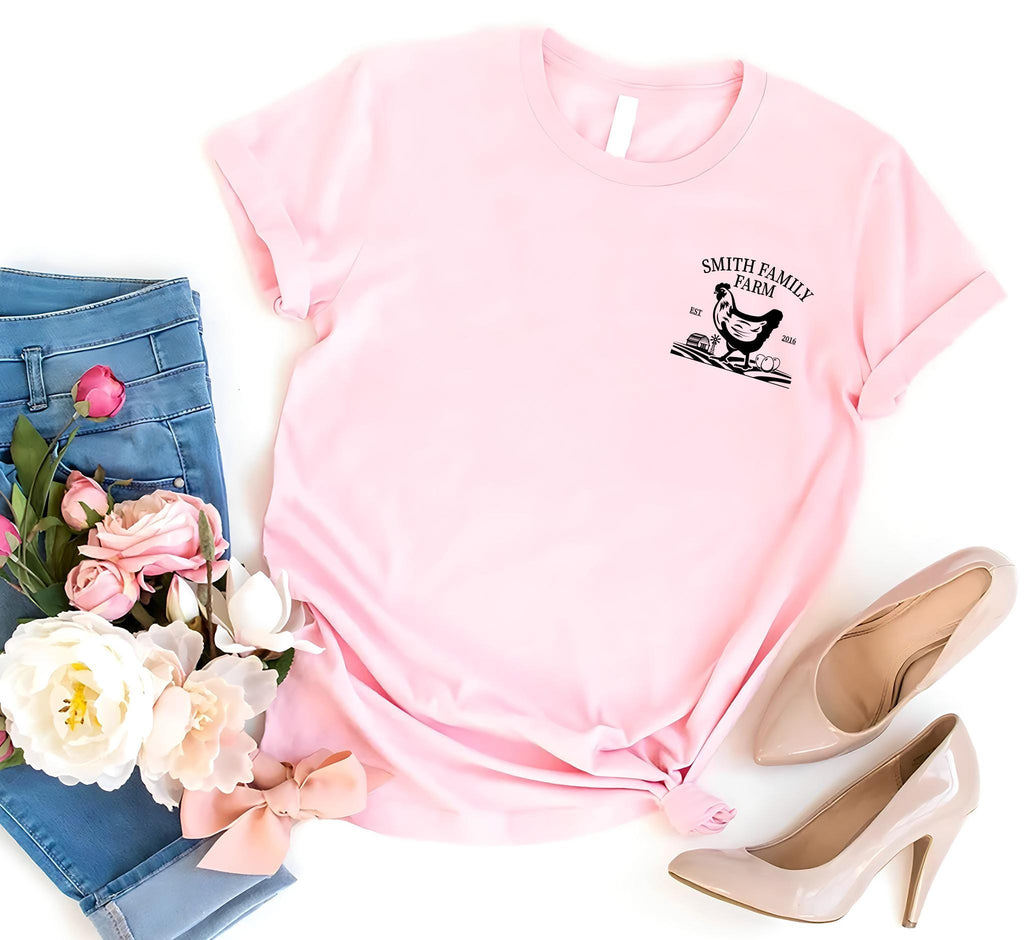 Introducing our custom farm name chicken shirt, the perfect gift for any chicken lover or farm enthusiast! This unique farm shirt allows you to personalize it with your own family farm name, making it an ideal choice for farm moms and families who cherish their farm life. Made from high-quality materials, our custom chicken shirt is not only comfortable but also adds a bit of fun to your wardrobe with its funny chicken designs. Whether you're enjoying a day at the farm or relaxing at home, this farm animal shirt is sure to delight fellow chicken lover shirts fans. Show off your pride for your family's heritage with our custom farm name tee, and make a statement with style!