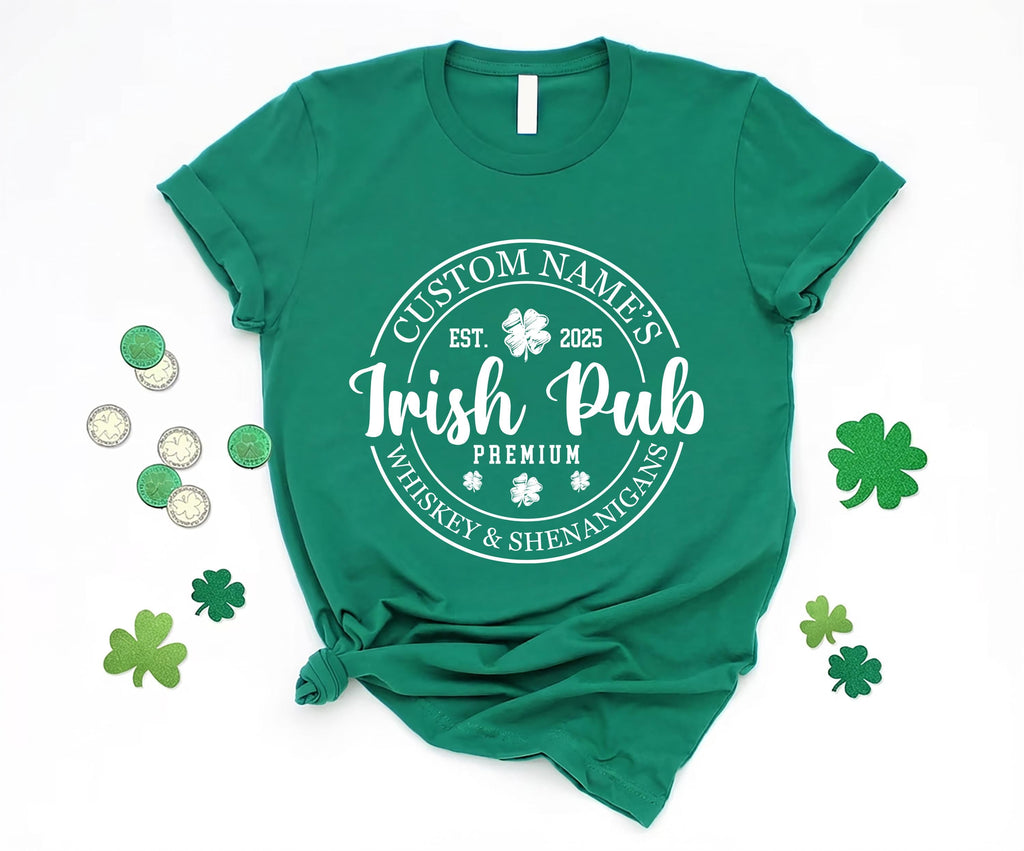 Celebrate St. Patrick’s Day in style with this Custom Irish Pub shirt — perfect for personalized pub names, drinking humor, and festive parties.