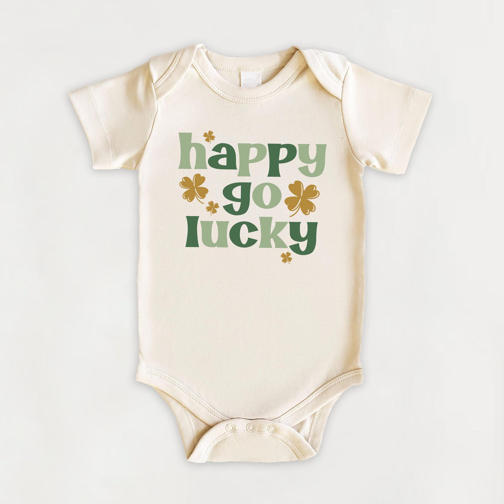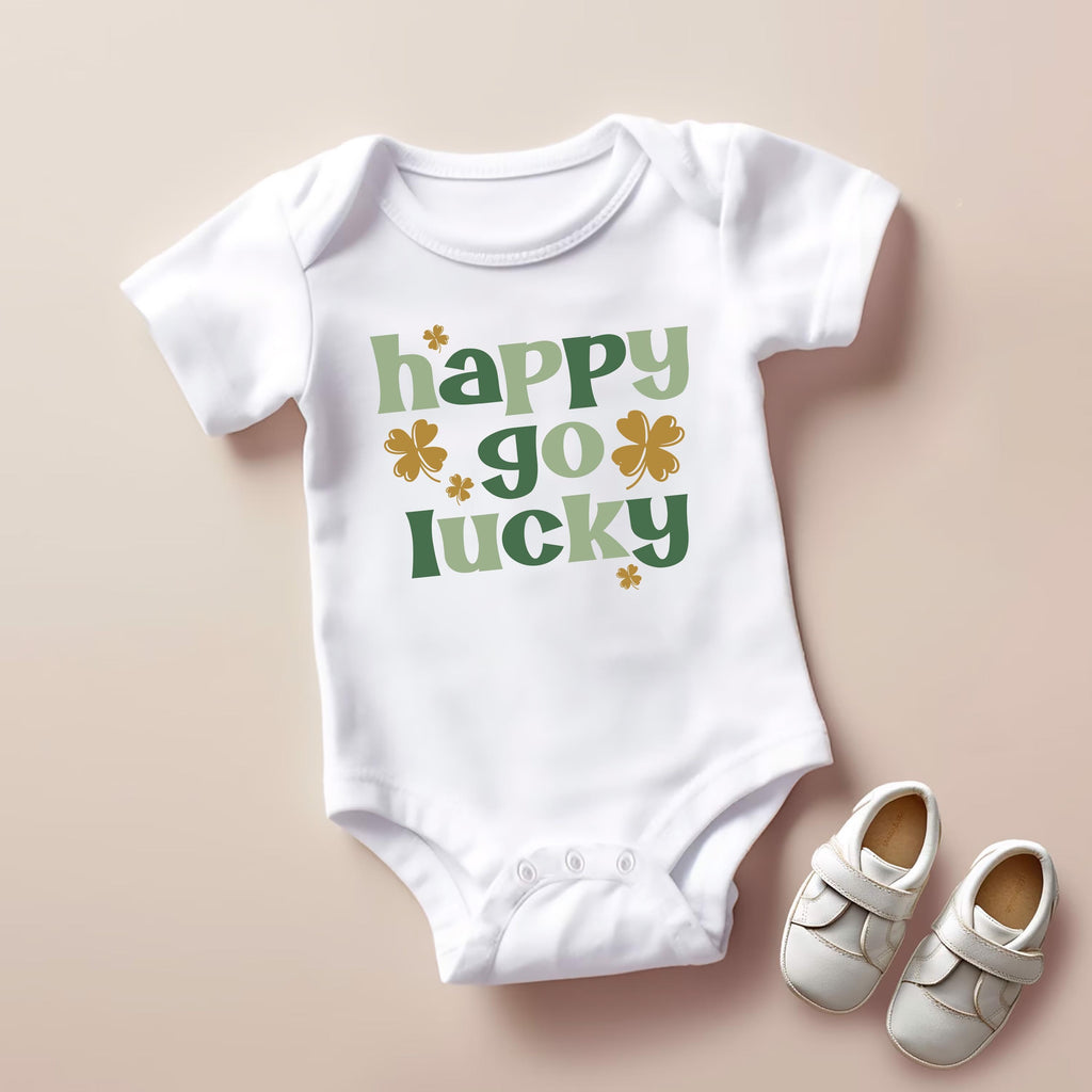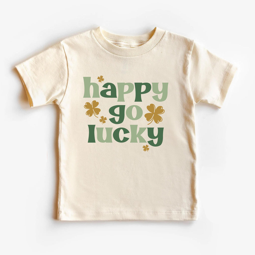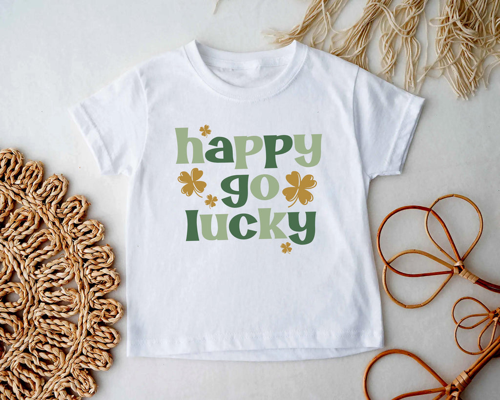 Celebrate St. Patrick’s Day in style with this Happy Go Lucky toddler shirt — perfect for festive outfits, photos, and little Irish vibes.
