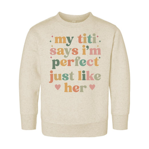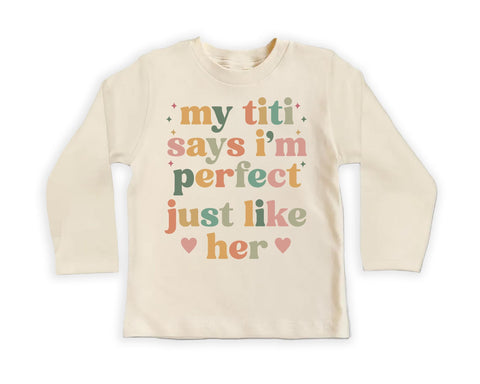 Celebrate that special bond with this My Titi Says I'm Perfect Just Like Her onesie, baby bodysuit, baby shirt, and toddler sweatshirt! Featuring a boho rainbow design, it's perfect for Titi's little bestie, baby showers, family photos, or gifting from a proud auntie to her favorite baby girl.