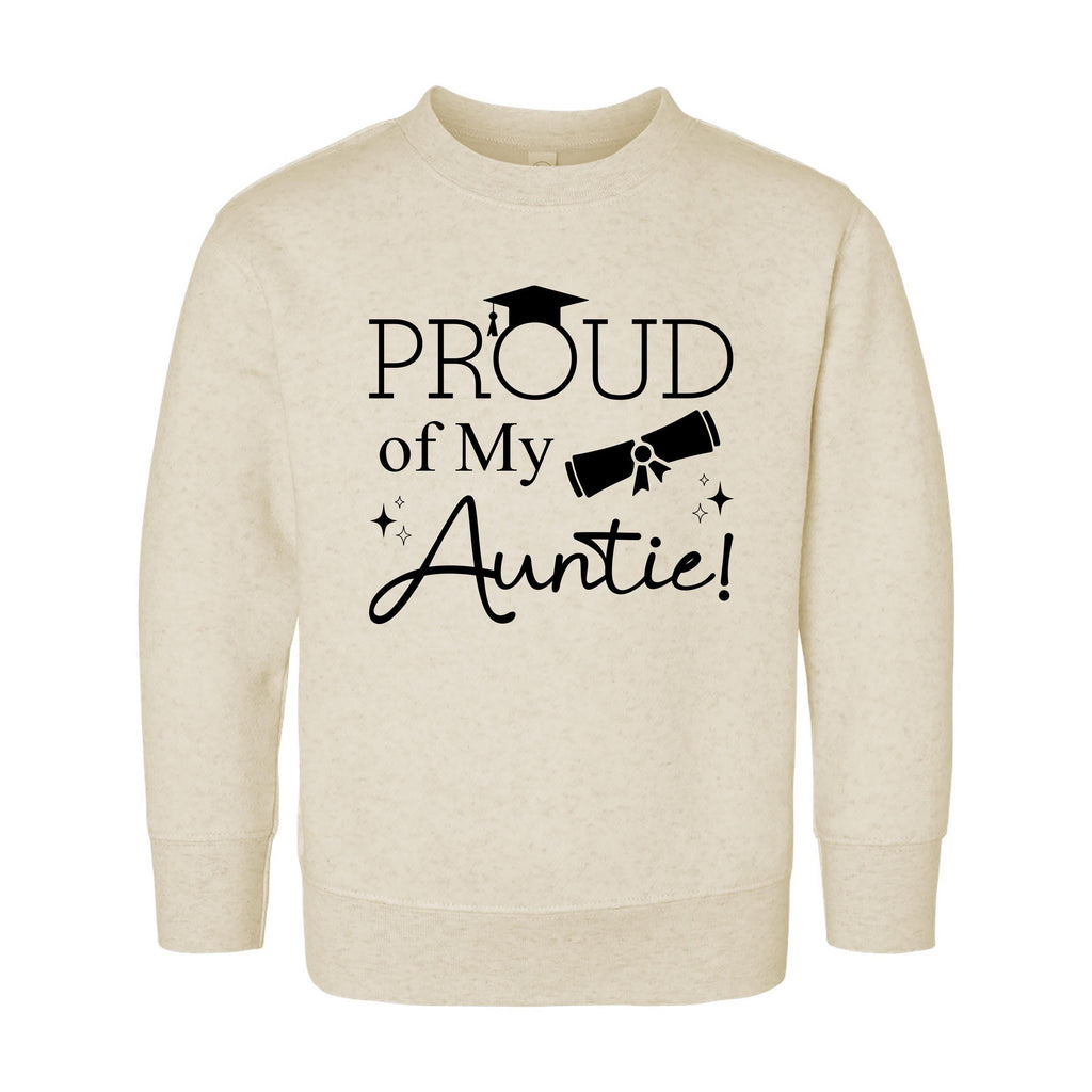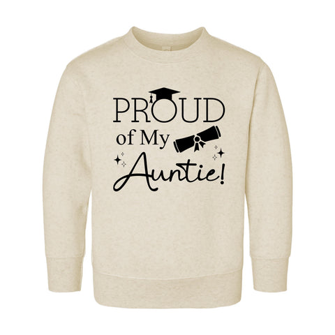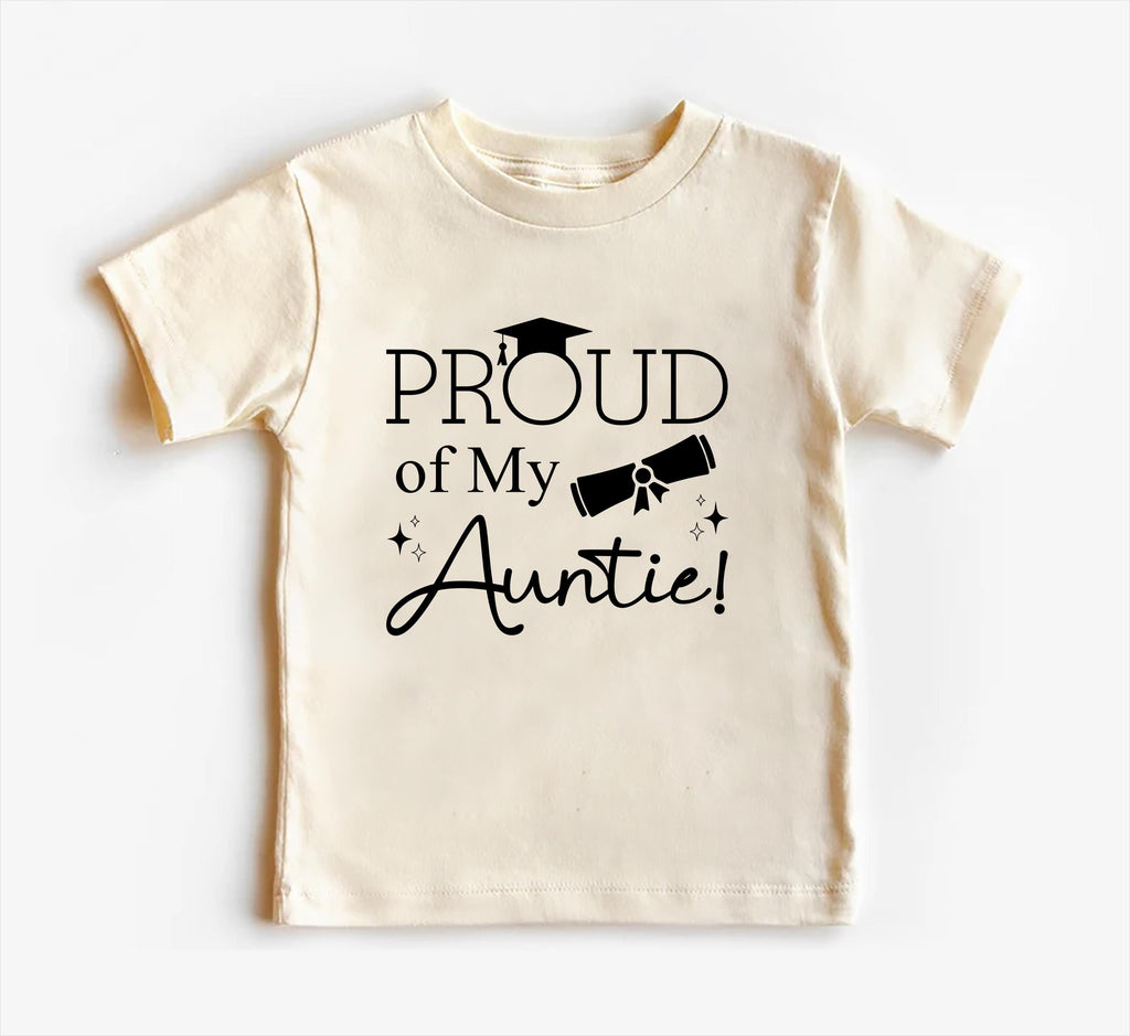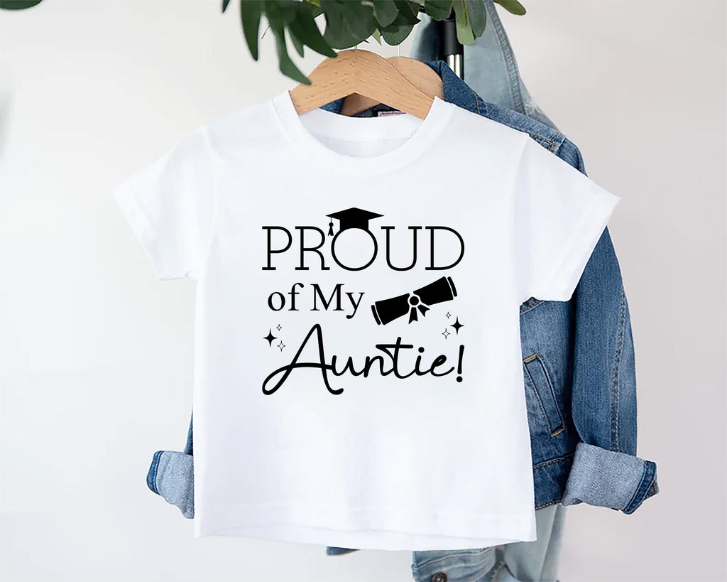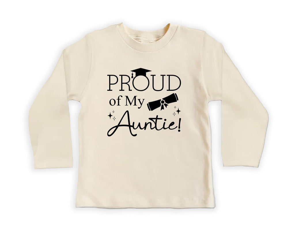Celebrate the special bond between baby —this adorable "Proud of My Auntie" baby bodysuit, baby shirt, and toddler sweatshirt is perfect as a graduation gift, surprise pregnancy reveal, or baby shower present. Whether she’s becoming an aunt for the first time or already the bestie auntie, this cute outfit is sure to warm her heart.