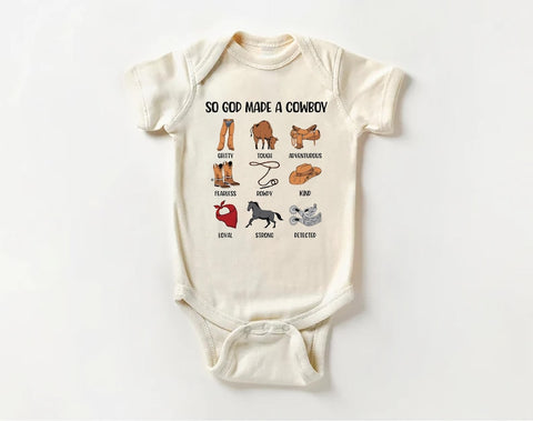 Celebrate cowboy spirit with this adorable "So God Made a Cowboy" baby bodysuit, baby shirt, and toddler sweatshirt! Perfect for little ranch hands, farm babies, and western-loving families, this outfit is great for country-themed baby showers, rodeo events, and cowboy-inspired gifts.