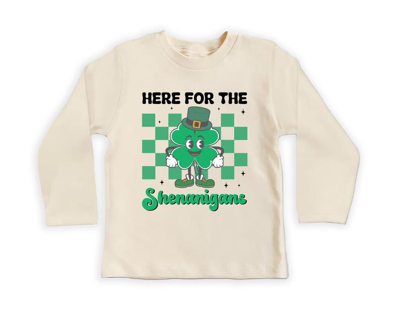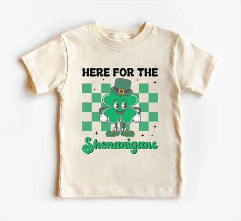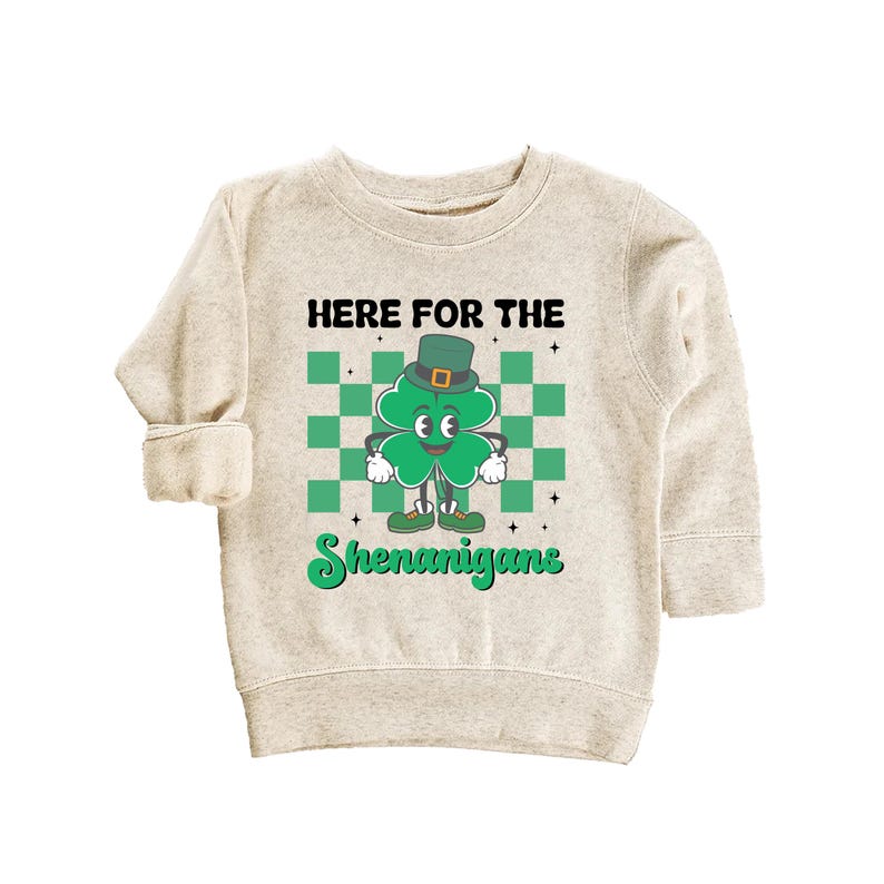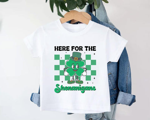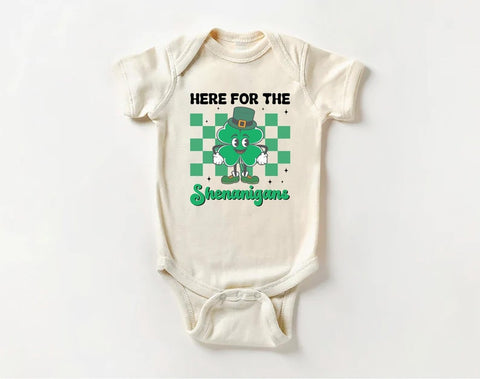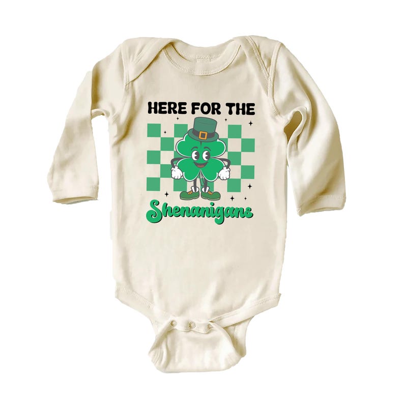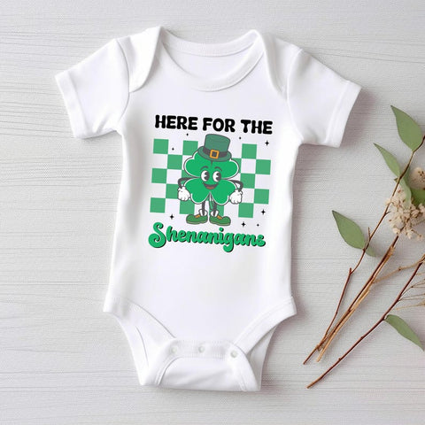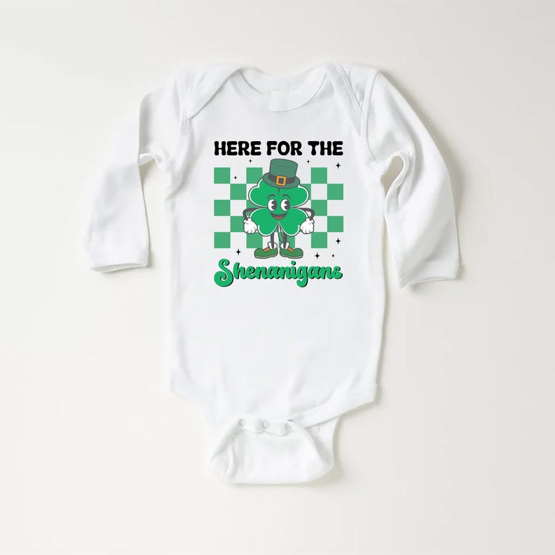 St. Patrick's Day Baby Bodysuit, Here for the Shenanigans Baby Shirt, Toddler Sweatshirt - Four Leaf Clover Kids Outfit for St. Paddy’s Day