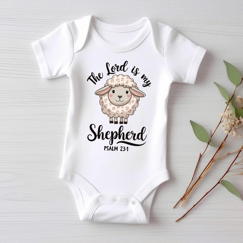 Made for newborns, infants, and toddlers, this faith-based baby outfit is crafted from soft, high-quality fabric for all-day comfort. Whether you're looking for a Christian baby gift, a baptism outfit, or a meaningful Psalm 23:1 design, this is a perfect choice. Order now and share God's love through this special piece!
