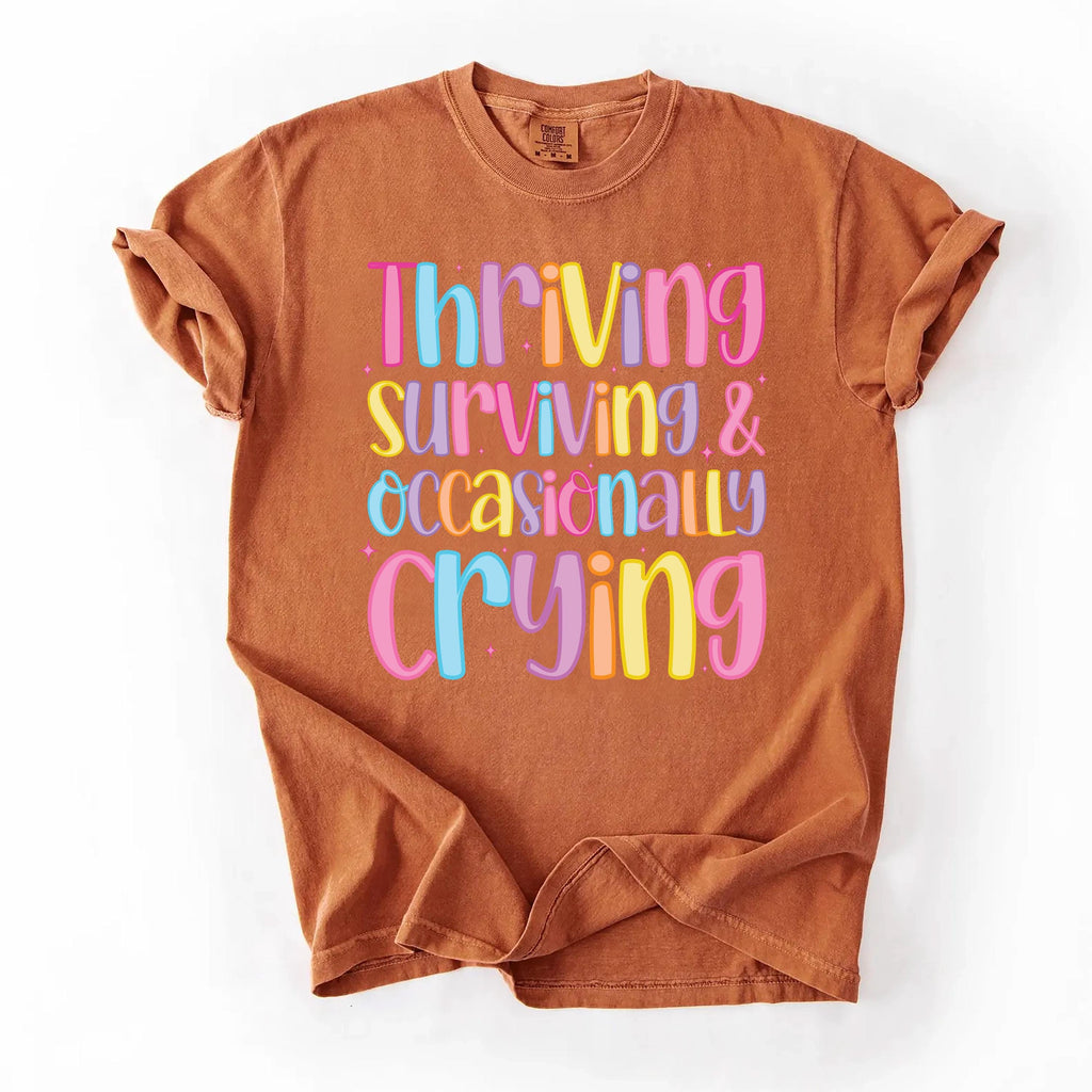 Laugh through the chaos with this โ€œThriving, Surviving & Occasionally Cryingโ€ shirt โ€” a funny and relatable take on modern mental health.