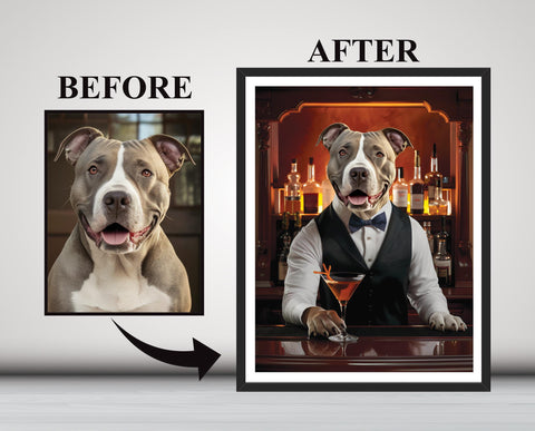 Personalized Pet Portrait Painting, Bartender Dog Artwork from Photo, Custom Gift for Dog Dad, Printable Wall Art, Bar Canvas Poster Decor.