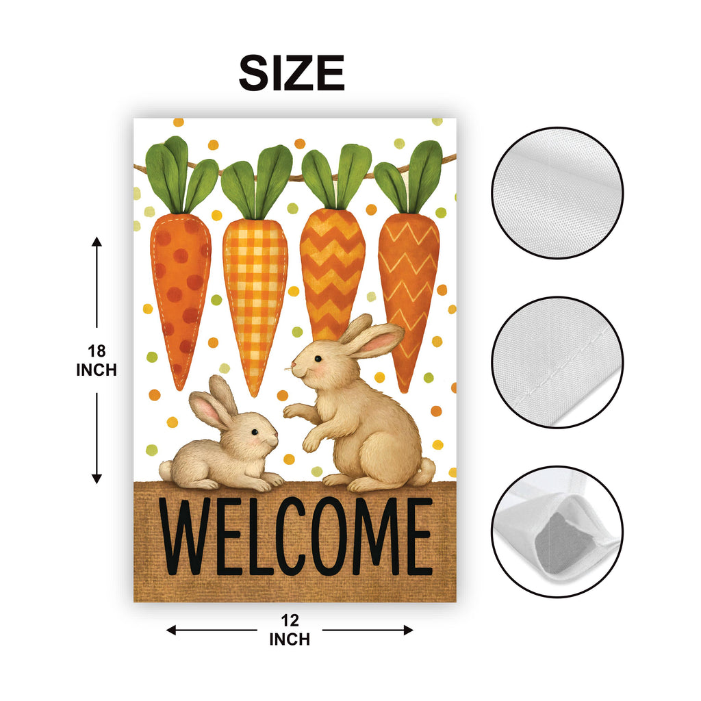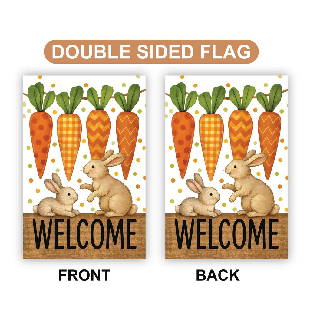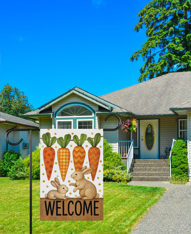 Greet guests with sweet spring charm using this Bunny Carrot Welcome Garden Flag, featuring playful rabbits and fun patterned carrots. A cute farmhouse look perfect for the Easter season.