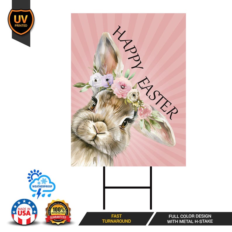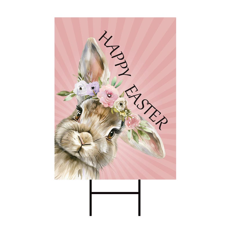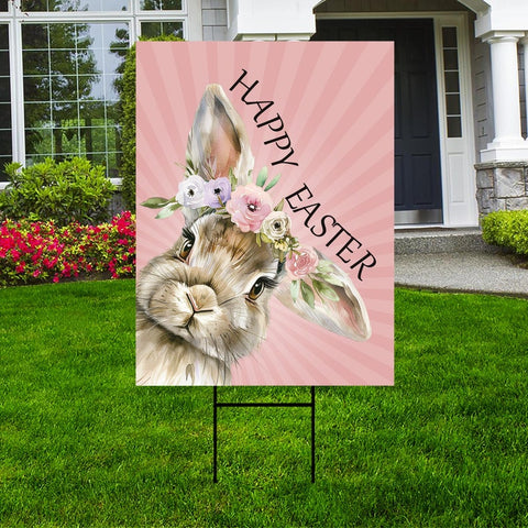 Happy Easter Bunny Welcome Yard Sign, Rabbit Flower Easter Day Yard Holiday Decorations, Easter Bunnies Garden Lawn Signs with Metal H-Stake. Economical and durable, our Coroplast Yard Signs are a staple of outdoor advertising. This Happy Easter Yard Sign Decoration full color direct printed graphics are vertically fluted for use with an H-Stake. Coroplast is typically used for yard, parking, real estate, and election signs. They are waterproof. Crafted with care, each piece is made to order, ensuring a unique, personalized touch just for you