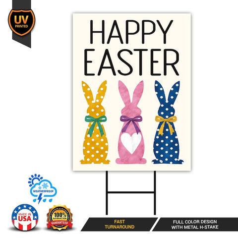 Happy Easter Polka Dot Rabbit Welcome Yard Sign, Love Heart Bunny Bow Easter Day Decorations, Polka Dot Bunny Lawn Signs with Metal H-Stake. Economical and durable, our Coroplast Yard Signs are a staple of outdoor advertising. This Happy Easter Yard Sign Decorations full color direct printed graphics are vertically fluted for use with an H-Stake. Coroplast is typically used for yard, parking, real estate, and election signs. They are waterproof. Crafted with care, each piece is made to order, ensuring a unique, personalized touch just for you
