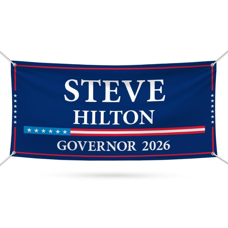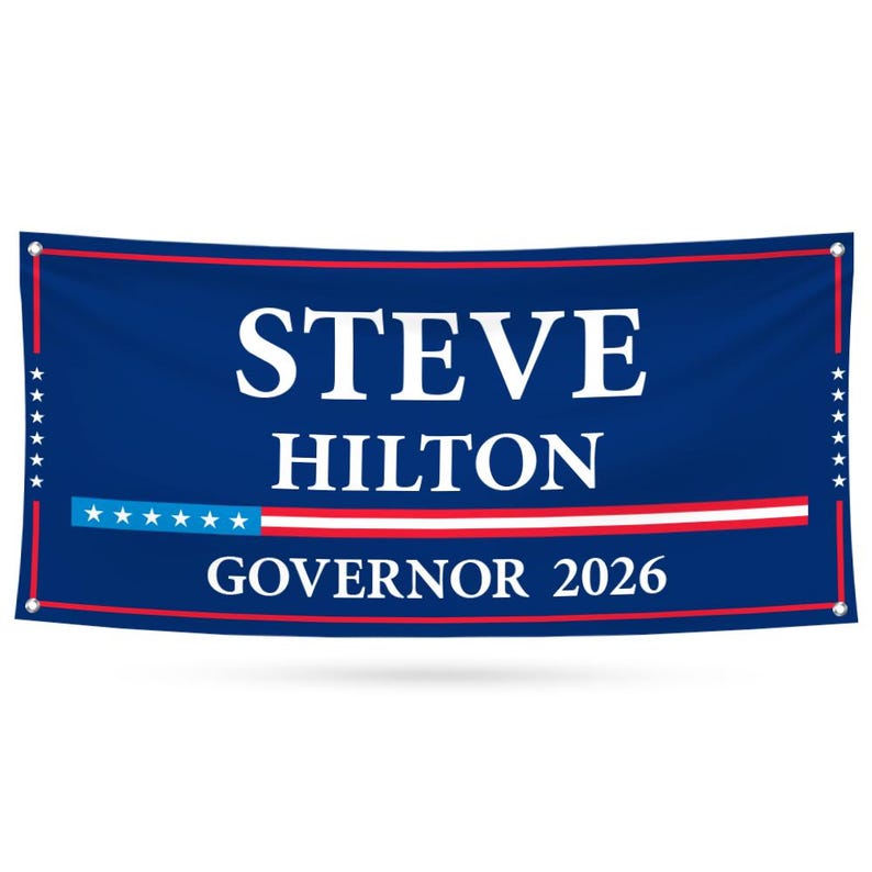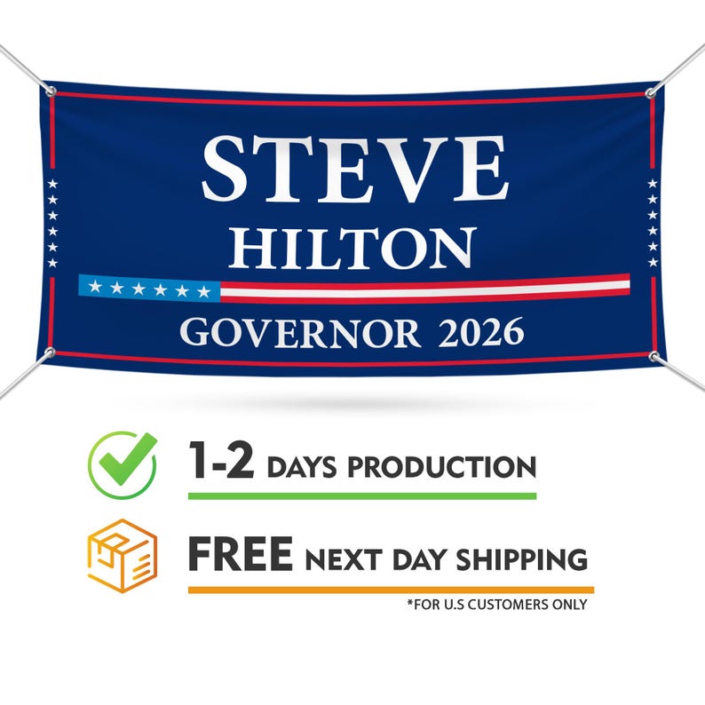 Steve Hilton For California U.S. Governor Banner Sign, 13 oz Waterproof US Governor Election 2026 Vinyl Banner With Metal Grommets. All Banners Are Printed Using the Industry Best Latex Ink Technology and All Banners Include Metal Grommets in Each Corner for Easy Hanging. Larger Banners Receive Additional Grommets and Reinforced Hemming Along All Sides. We Suggest All Grommets Be Used During Installation To Prevent Damages To The Banner. Perfect for Indoor And Outdoor Use. Steve Hilton For California 2026 Banner is Waterproof And UV Safe. MADE IN USA. Crafted with care, each piece is made to order, ensuring a unique, personalized touch just for you