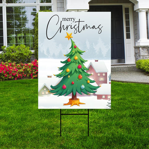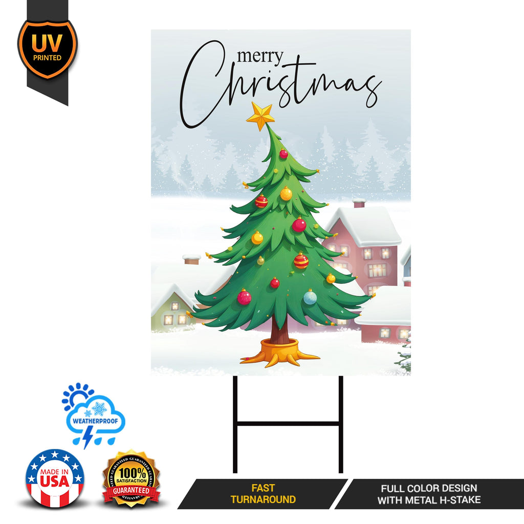 Christmas Yard Sign - Coroplast Christmas Tree Lawn Sign, Holiday, Winter, Xmas Tree, Merry Christmas Welcome Yard Sign with Metal H-Stake. Economical and durable, our Coroplast Yard Signs are a staple of outdoor advertising. These outdoor Merry Christmas Yard Sign full color direct printed graphics are vertically fluted for use with an H-Stake. Coroplast is typically used for yard, parking, real estate, and election signs. They are waterproof. Crafted with care, each piece is made to order, ensuring a unique, personalized touch just for you