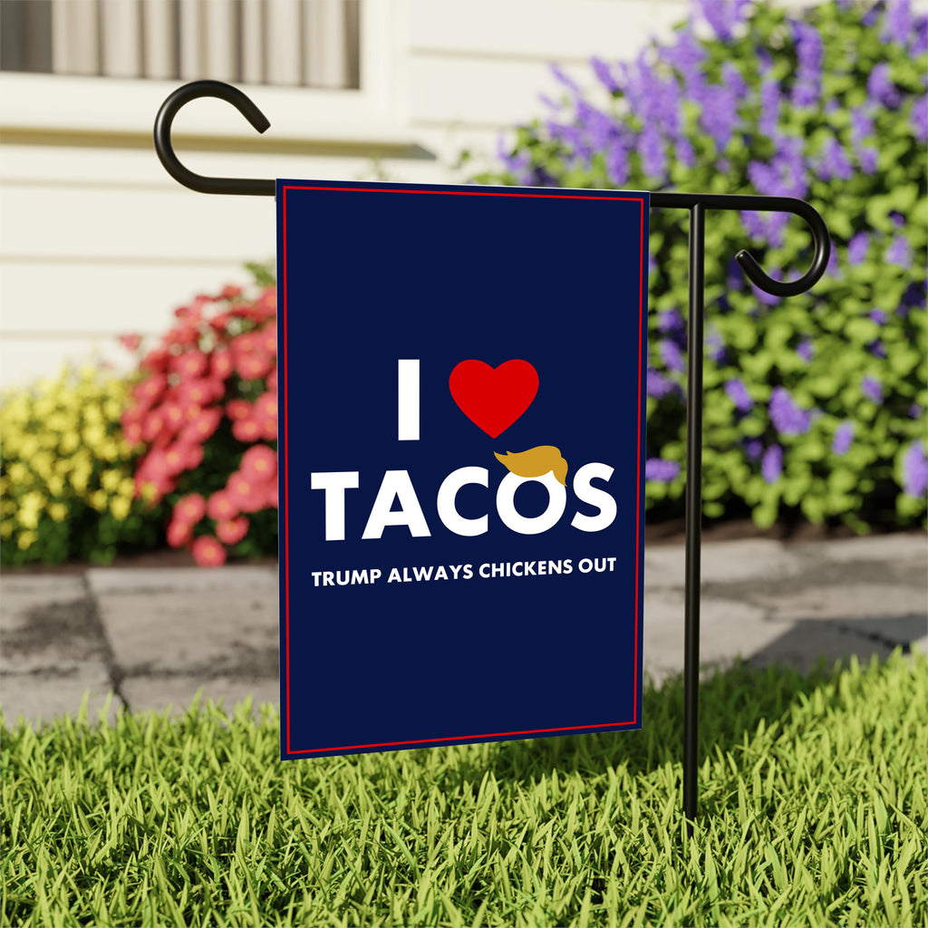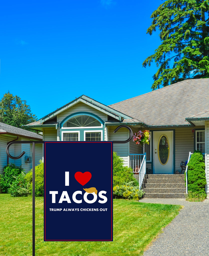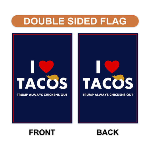 I Love Tacos Trump Always Chickens Out Protest Garden Flag, Double Sided, Resist Hate, Anti-Trump, Resist Racism Flag, Resist Fascism Flag100% Polyester.Same Design is Printed On Both Sides.Black Inside Lining.Features Sleeve At Top.Pole, Hooks, Or Fasteners Are Not Included.