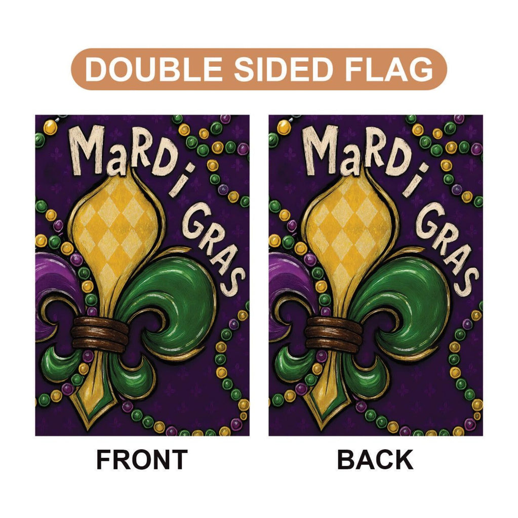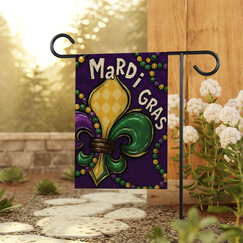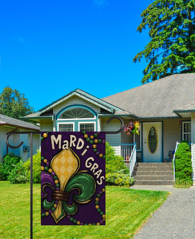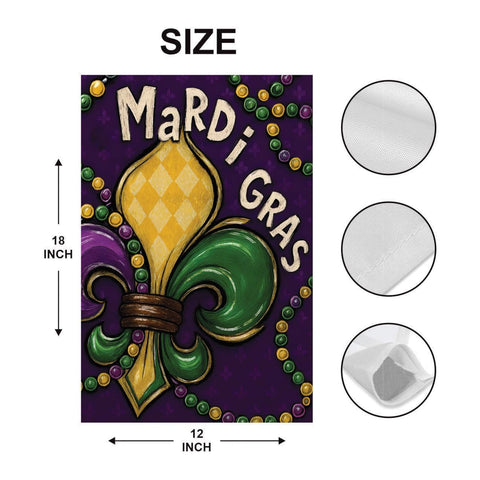 Celebrate Carnival season with this bold Mardi Gras Fleur-De-Lis Garden Flag, featuring classic New Orleans colors and traditional Mardi Gras symbolism. This festive yard flag adds rich purple, green, and gold style to your garden, porch, or outdoor décor.