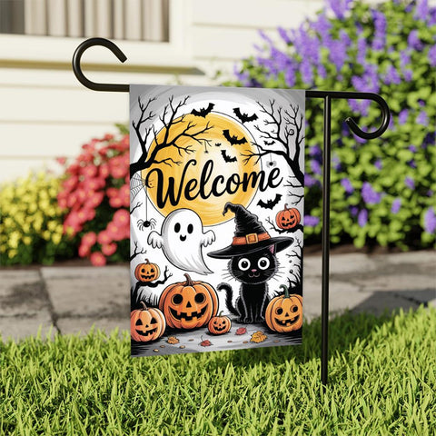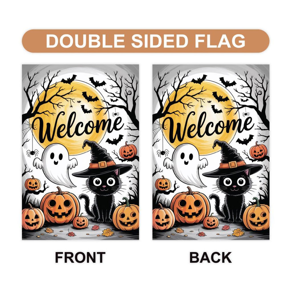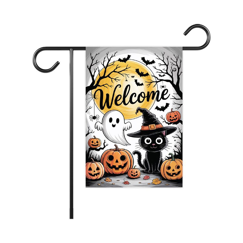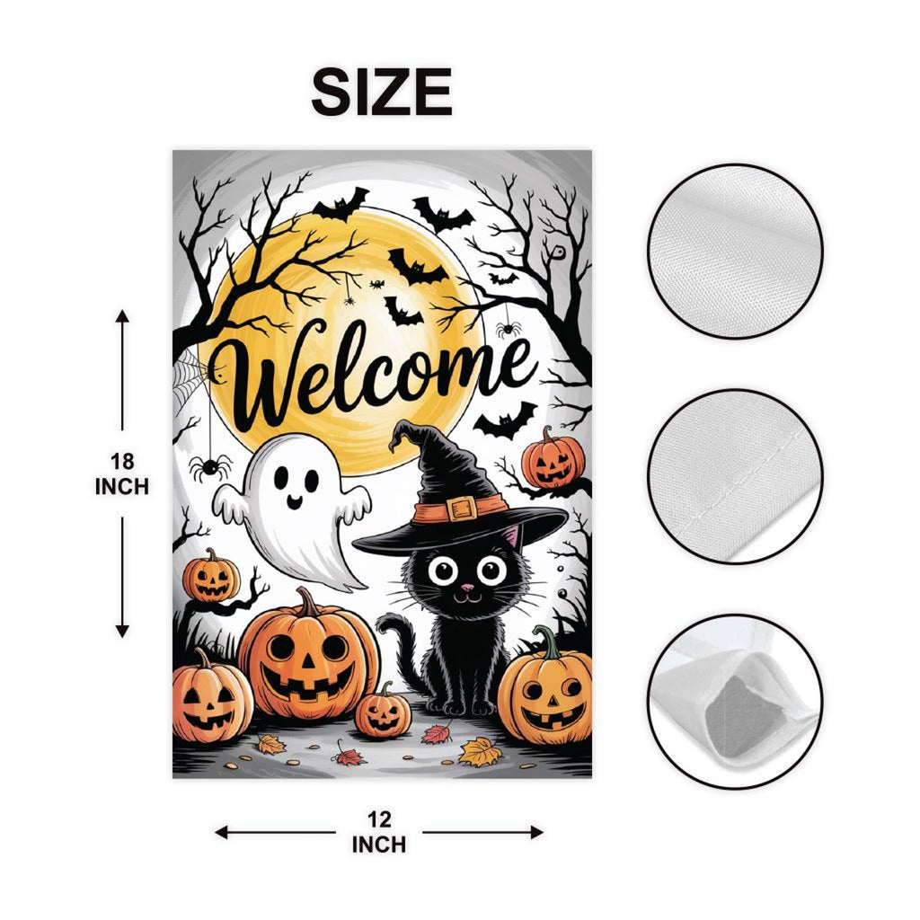 Welcome Halloween Garden Flag, Spooky Black Cat Ghost Pumpkin Yard Flag, Funny Small Fall Outdoor Decor, Holiday Cosplay Party Flag.100% Polyester.Same Design is Printed On Both Sides,Black Inside Lining.Features Sleeve At Top.Pole, Hooks, Or Fasteners Are Not Included.