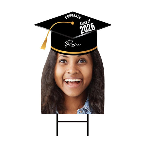 Custom Graduation Face Yard Sign 2026 - Class of 2026, Graduation Hat, Grad 2026, Personalized Graduation Head Yard Sign with Metal H-Stake. Economical and durable, our Coroplast Yard Signs are a staple of outdoor advertising. These Custom Class of 2026 Yard Sign full color direct printed graphics is vertically fluted for use with an H-Stake. Coroplast is typically used for yard, parking, real estate, and election signs. They are waterproof.
