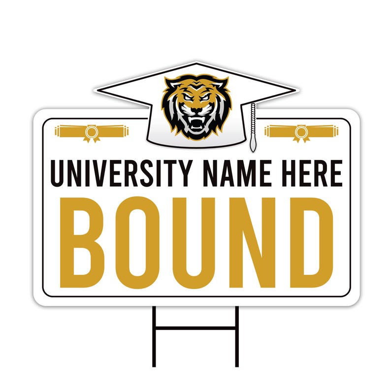 Personalized College Bound Yard Sign, College Logo Sign, Custom Graduate College University Bound Yard Sign with Metal H-Stake. Economical and durable, our Coroplast Yard Signs are a staple of outdoor advertising. These Custom College Bound Yard Sign full color direct printed graphics are vertically fluted for use with an H-Stake. Coroplast is used for yards, parking, real estate, and election signs. They are waterproof.