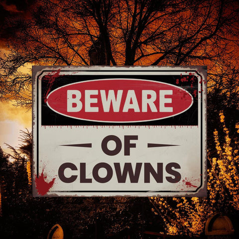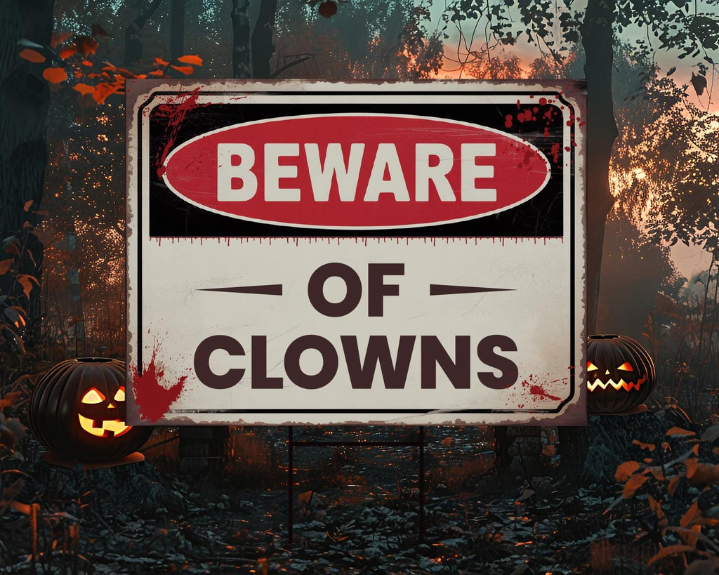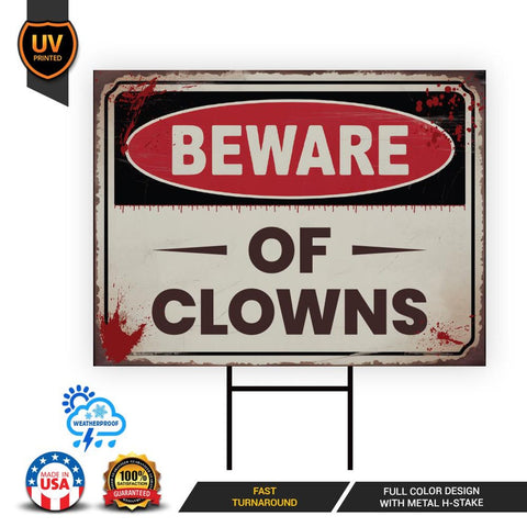 Beware of Clowns Yard Sign, Keep Out Halloween Lawn Decoration, Scary Spooky Outdoor Decor, Creepy Circus Warning Sign with Metal H-Stake. Economical and durable, our Coroplast Yard Signs are a staple of outdoor advertising. These outdoor Keep Out Halloween Yard Sign full color direct printed graphics are vertically fluted for use with an H-Stake. Coroplast is typically used for yard, parking, real estate, and election signs. They are waterproof.