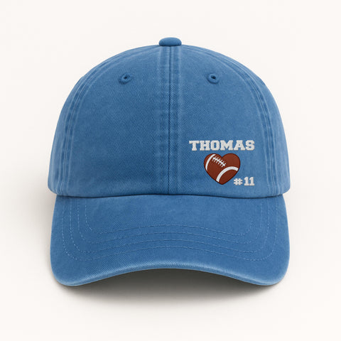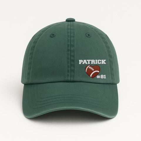 Show your game day pride with this Football Heart Embroidered Hat featuring your player's name and number! Whether you’re on the bleachers cheering for your kid or repping your school football team, this personalized cap is a stylish and meaningful gift for any proud football mom, dad, or fan. Choose between classic baseball cap or ponytail-back style.