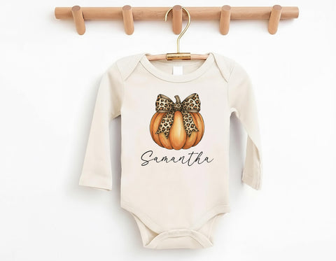 Make fall fun and stylish with our Personalized Pumpkin Fall Toddler Shirt! Featuring a cute pumpkin topped with a cheetah bow, this autumn tee can be personalized with your child’s name. Perfect for little girls during spooky season, pumpkin patch trips, and fall birthdays.