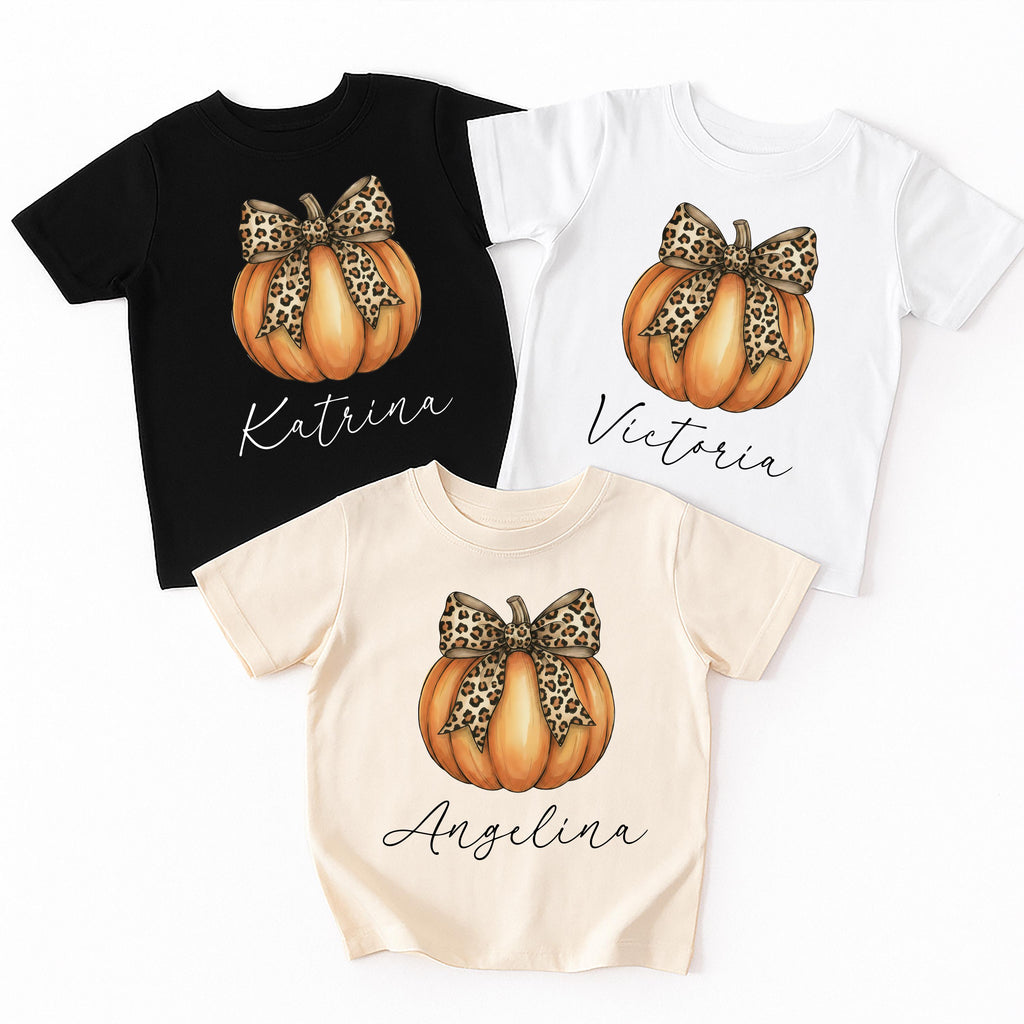Personalized Pumpkin Fall Toddler Shirt, Cute Pumpkin with Cheetah Bow Shirt, Girls Autumn Tee with Name, Girls Halloween Shirt, Fall Gifts