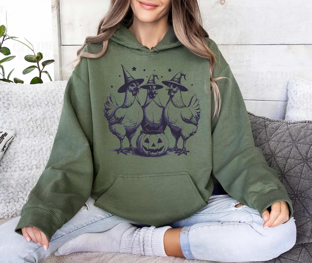 Add some barnyard magic to your spooky season wardrobe with this Chicken Witches Halloween shirt! Featuring a vintage-style witchy chicken graphic, this tee is perfect for women who love a mix of farm charm and Halloween fun.