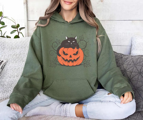 Cute Halloween Black Cat Hoodie, Spooky Pumpkin Halloween Tee, Trendy Halloween Crewneck Shirt, Unisex Fall Outfit, Halloween Gifts