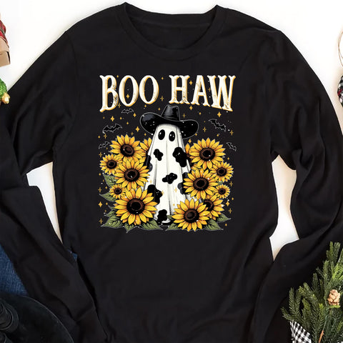 Boo Haw Long Sleeve Shirt, Cow Spot Ghost Western Halloween Tee, Retro Fall Sunflower Cowgirl Shirt, Spooky Country Shirt, Unisex Fall Tee