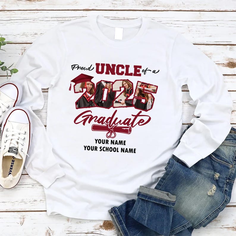Custom Proud Family Graduation Long Sleeve Shirt, Group 2025 Grad Shirt, Senior 25 Long Sleeve Shirt, Graduation Squad Shirt, High School Graduate Gift: 100% cotton, high-quality knitted fabric, soft touch with a classic fit that lies flat. Keep cool and dry with our Custom Proud Family Graduation Shirt. Our quick-dry fabric helps evaporate moisture and naturally regulate body temperature. It can be worn alone or as a layering piece adding depth to your wardrobe. Crafted with care, each piece is made to order, ensuring a unique, personalized touch just for you