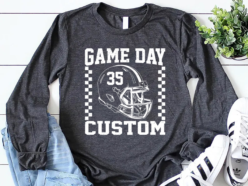 Show your pride with our Game Day Custom Shirt! Add your player’s helmet number or name for a personalized football season design. Perfect for high school football, football moms, and game day spirit wear.
