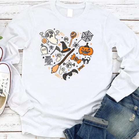 Halloween Doodles Heart Long Sleeve Shirt, Cute Halloween Pumpkin Witch Shirt, Halloween Mom Tee, Unisex Spooky Season Shirt, Fall Gifts, Gifts for Her