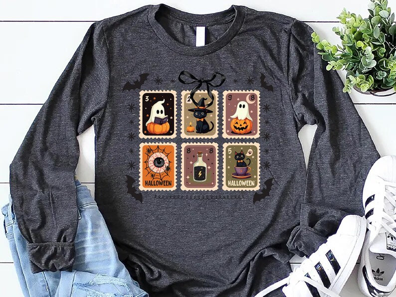 Retro Halloween Stamps Long Sleeve Shirt, Cute Ghost and Black Cat Tee, Spooky Fall Aesthetic Shirt, Halloween Shirt, Unisex Autumn Shirt, Gifts for Her