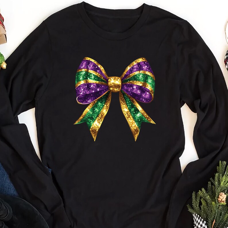 Mardi Gras Coquette Bow Long Sleeve Shirt, Beads Louisiana Shirt, Festival Long Sleeve T-Shirt, New Orleans Carnival Shirt, Mardi Gras Bow Gift