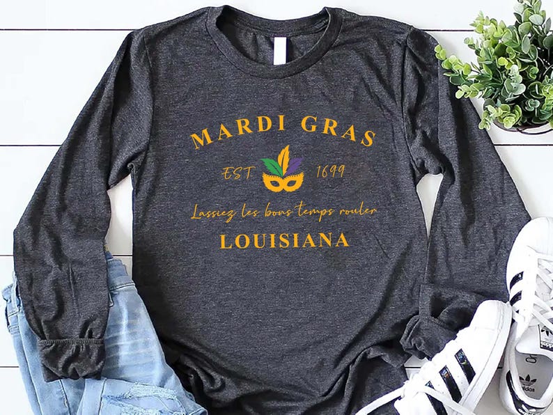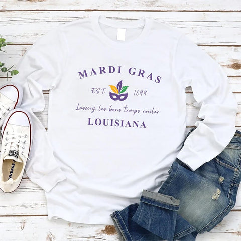 Mardi Gras Long Sleeve Shirt, Louisiana Mardi Gras Shirt, Mardi Gras Celebrations Long Sleeve Tee, Louisiana State Shirt, Mardi Gras Party Gift: 100% cotton, high-quality knitted fabric, soft touch with a classic fit that lies flat. Keep cool and dry with our Mardi Gras Shirt. Our quick-dry fabric helps evaporate moisture and naturally regulate body temperature. It can be worn alone or as a layering piece adding depth to your wardrobe. Crafted with care, each piece is made to order, ensuring a unique, personalized touch just for you