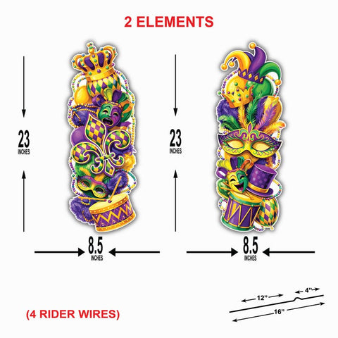 Make a bold statement this parade season with these striking Mardi Gras Yard Sign Cutouts. Featuring tall vertical designs filled with carnival masks, crowns, drums, feathers, fleur-de-lis details, and classic purple, green, and gold colors, these signs bring dramatic New Orleans flair to your front yard or garden.