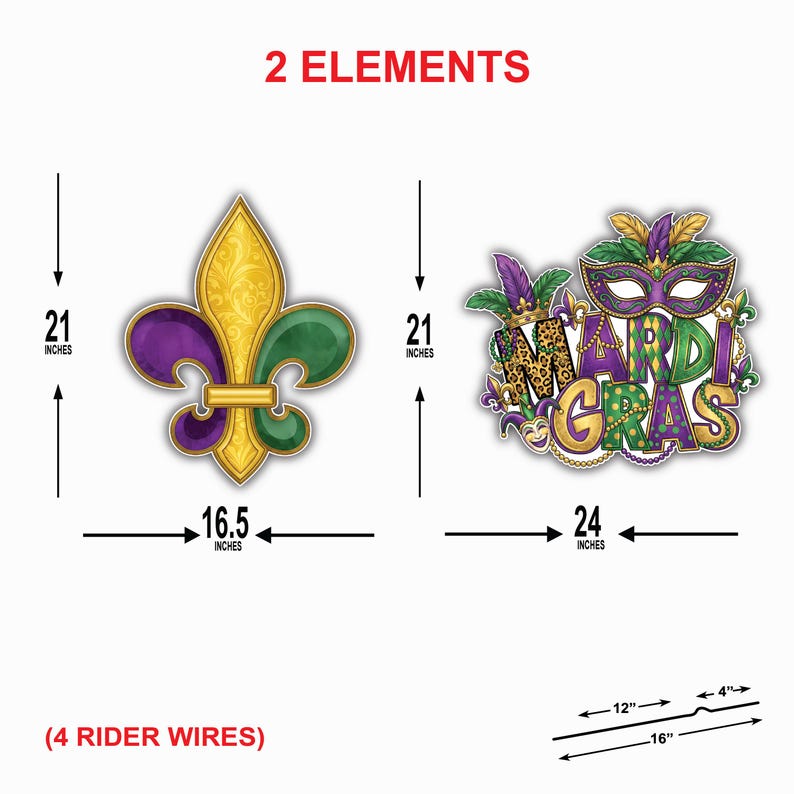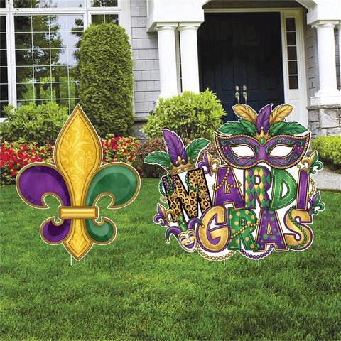 Celebrate Mardi Gras with bold, classic carnival style using these Mardi Gras Yard Sign Cutouts. Featuring a vibrant fleur-de-lis design and a colorful Mardi Gras sign with masks, beads, and festive lettering, these yard decorations bring authentic New Orleans flair to your lawn or garden.