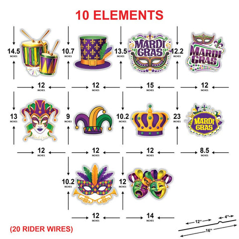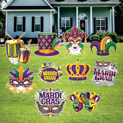 Create a bold and festive lawn display with this vibrant Mardi Gras Yard Sign Cutouts Set. Featuring classic carnival elements like masks, crowns, drums, jesters, hats, beads, and “Mardi Gras” lettering, this set brings full parade-season energy to your front yard or garden.